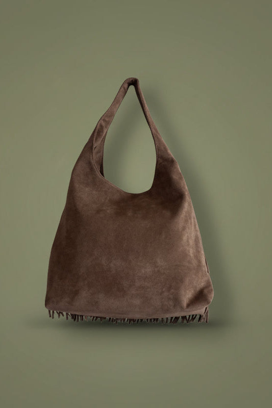 El Bolso CALIMA es una pieza con alma libre y espíritu urbano. Confeccionado en ante suave, destaca por sus flecos en movimiento y sus tachas doradas envejecidas, que aportan carácter y un aire artesanal sofisticado, ideal para la colección de primavera.