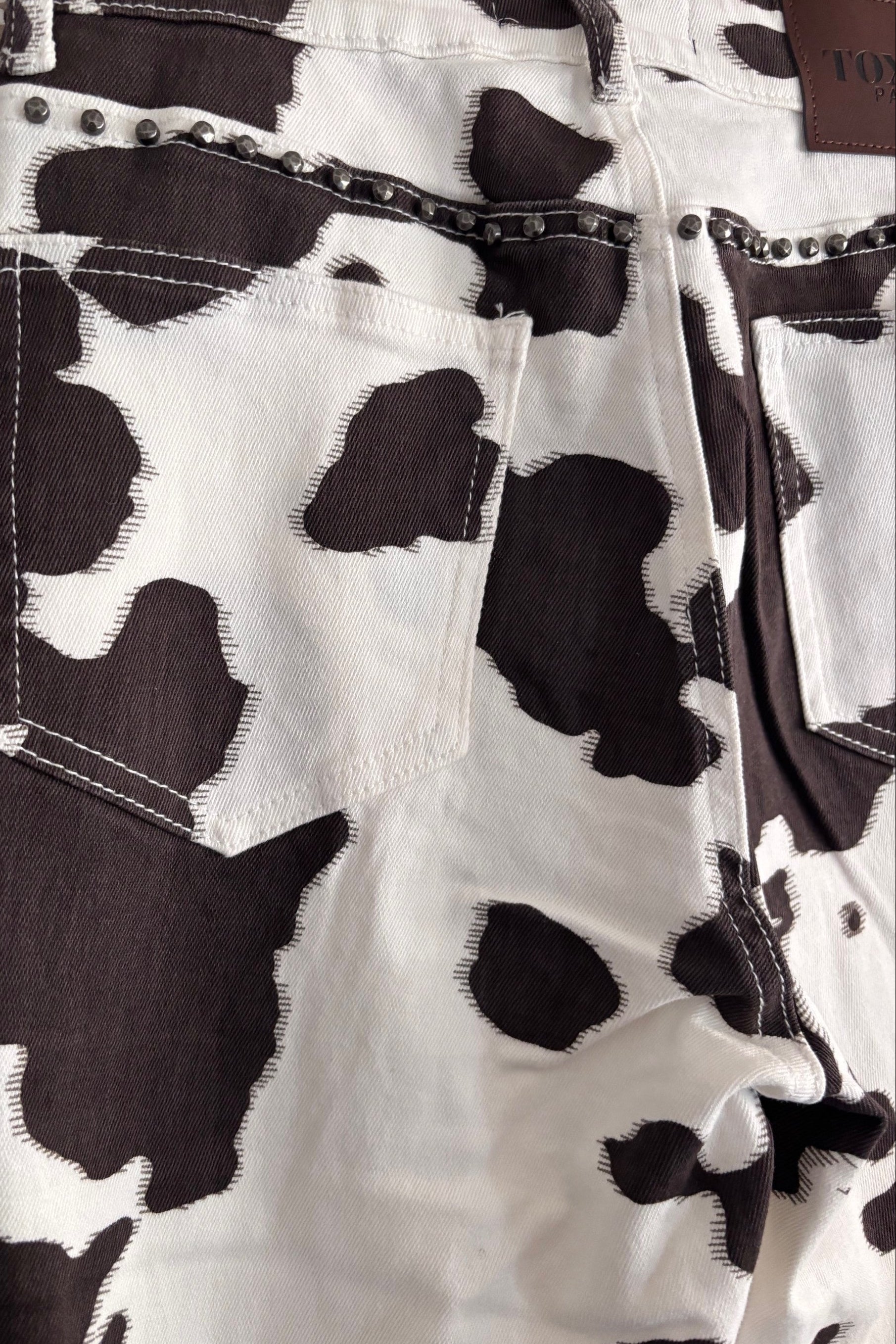 Jeans Cow, la pieza que transforma cualquier look de primavera en un auténtico statement. Confeccionado en denim de alta calidad, combina un print cow con tachas metálicas en bolsillos delanteros y trasero.