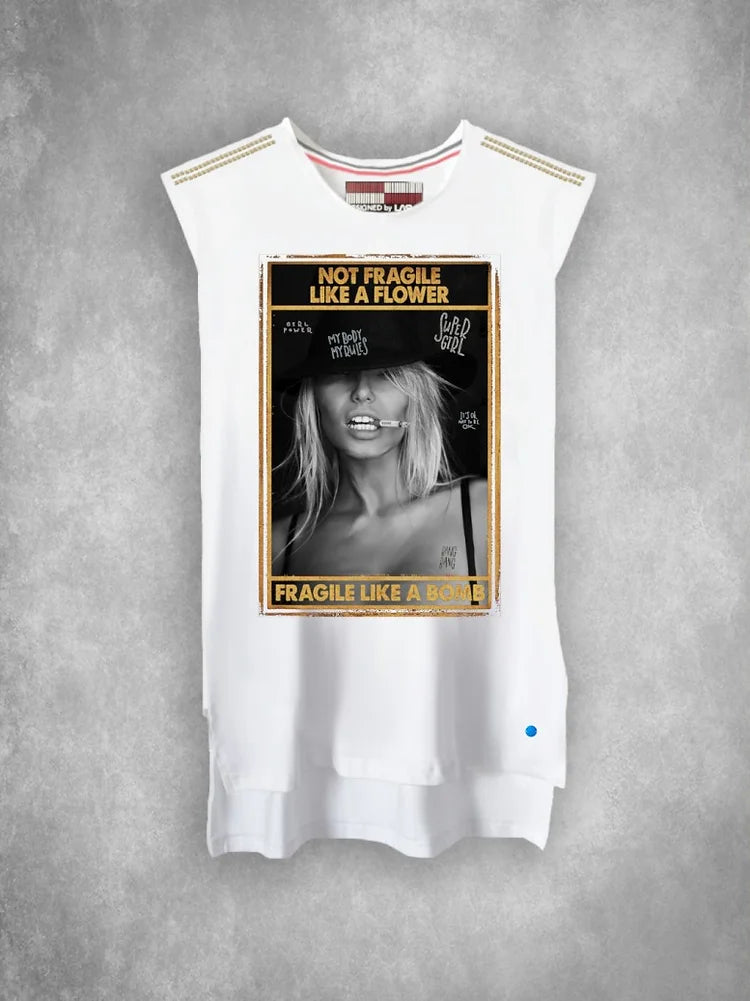 - Round neck, sleeveless. 100% 180g cotton. Digital print on the front.