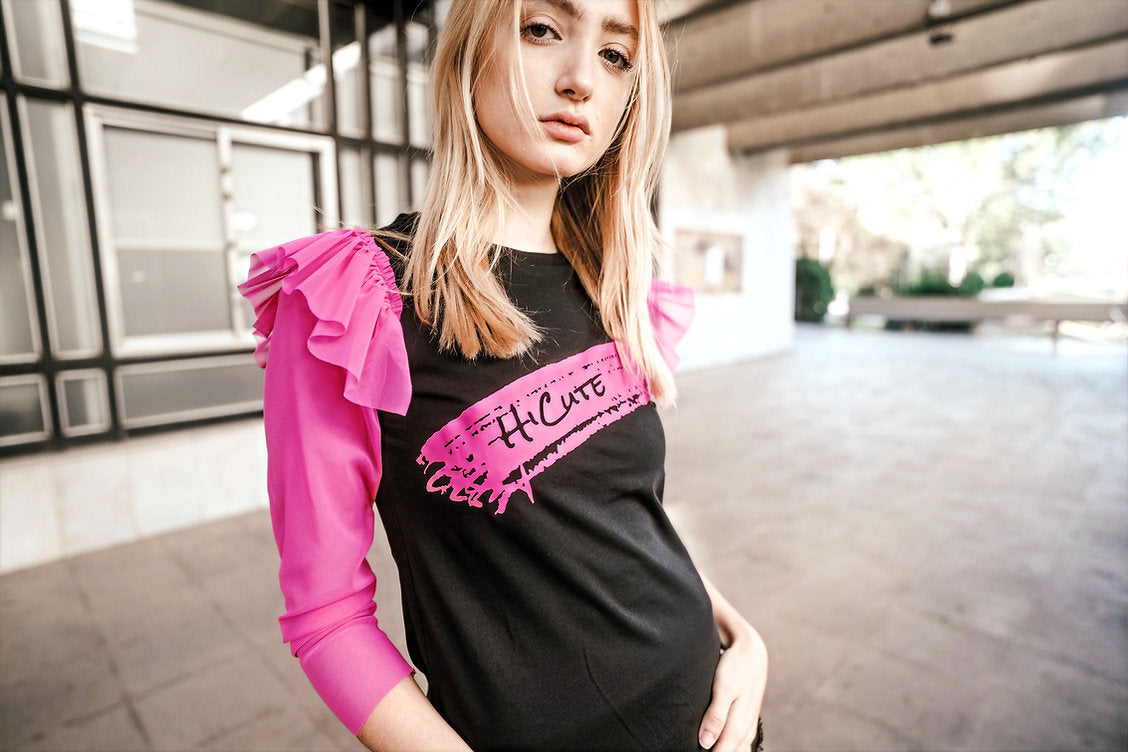 Make your style pop with our Viola cotton tee! With long tulle sleeves and ruffles at the shoulders, this shirt is perfect for adding a touch of adventure to your outfit. Plus, its front print ensures a bold and inspiring look. Get it now!