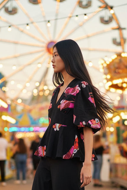 La blusa de Minueto destaca por su diseño original, divertido y lleno de personalidad. Confeccionada en un tejido ligero y fluido, combina un fondo negro elegante con un estampado vibrante de patines en tonos fucsia, coral y naranja que aporta un toque pop muy característico de la marca.