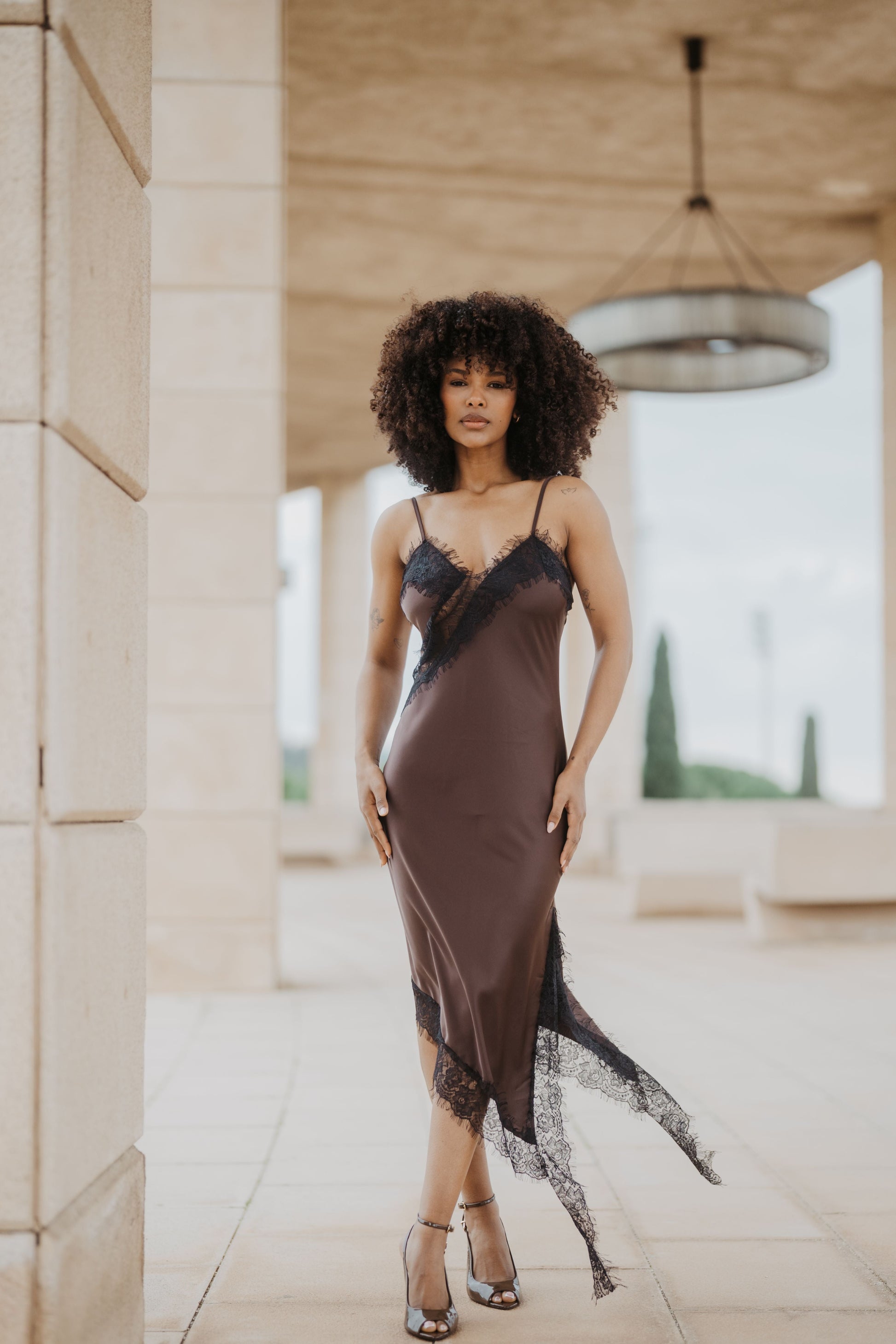 Elegancia sin esfuerzo, actitud infinita. Este vestido lencero redefine el concepto de sofisticación moderna con una silueta fluida que abraza el cuerpo y un acabado satinado que aporta luz y movimiento.