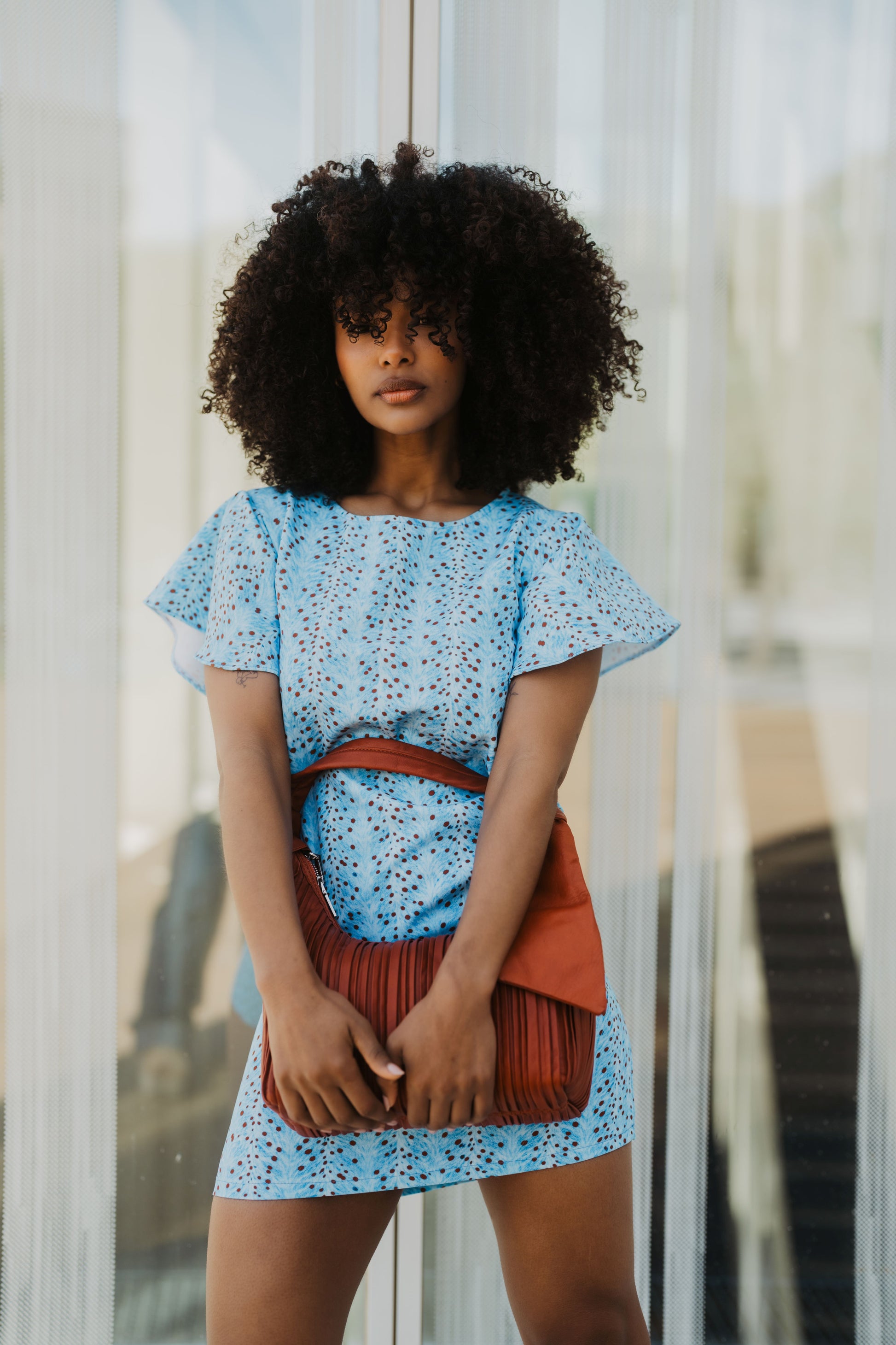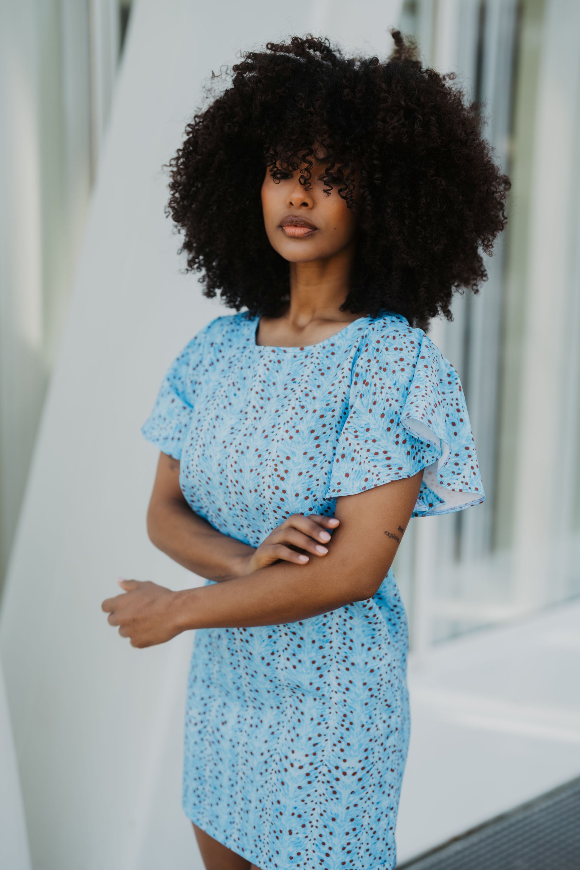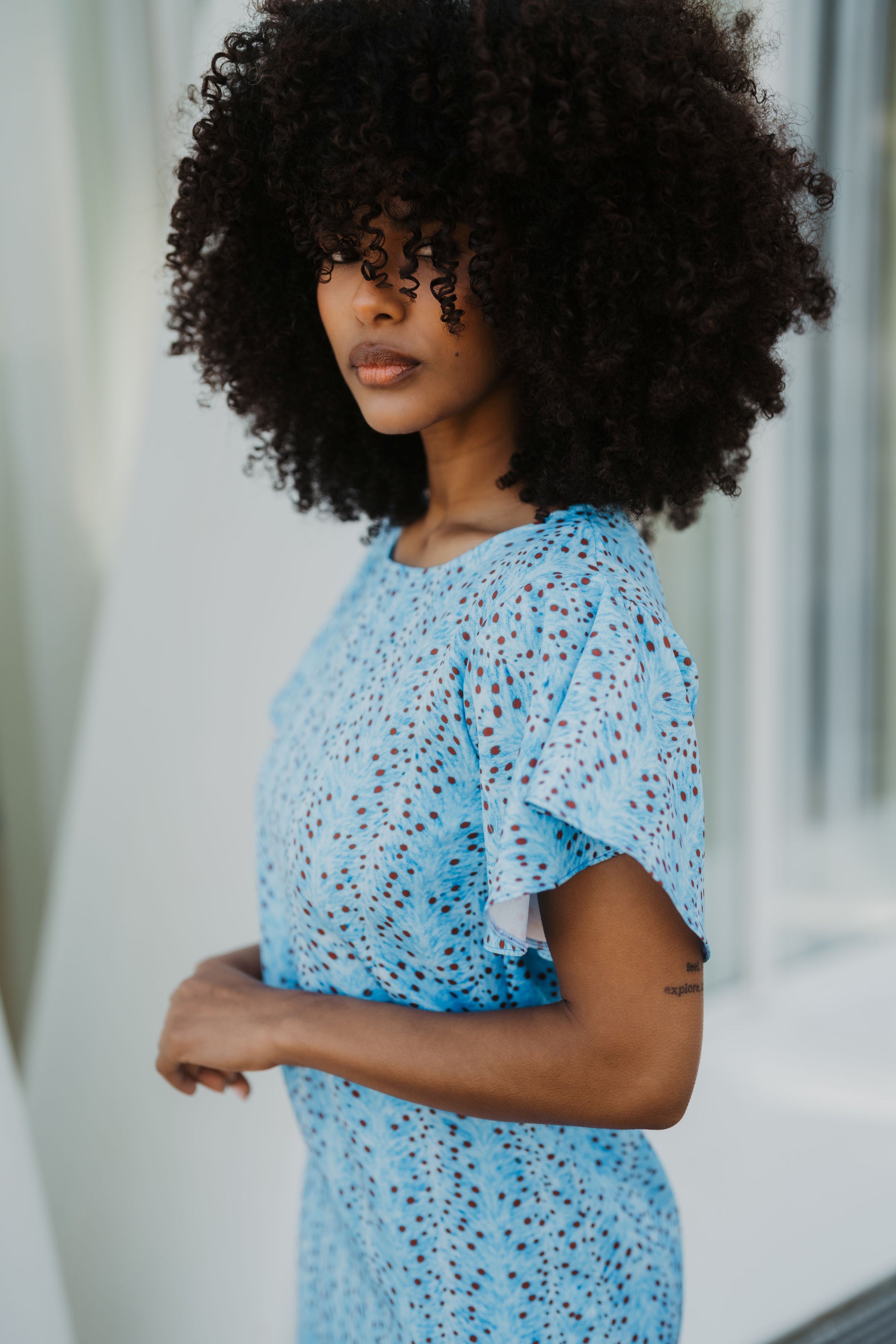 El tono azul cielo se fusiona con el delicado print Bambi, creando una pieza luminosa, moderna y fácil de llevar. Las mangas con volantes añaden un toque romántico y femenino que eleva el diseño.