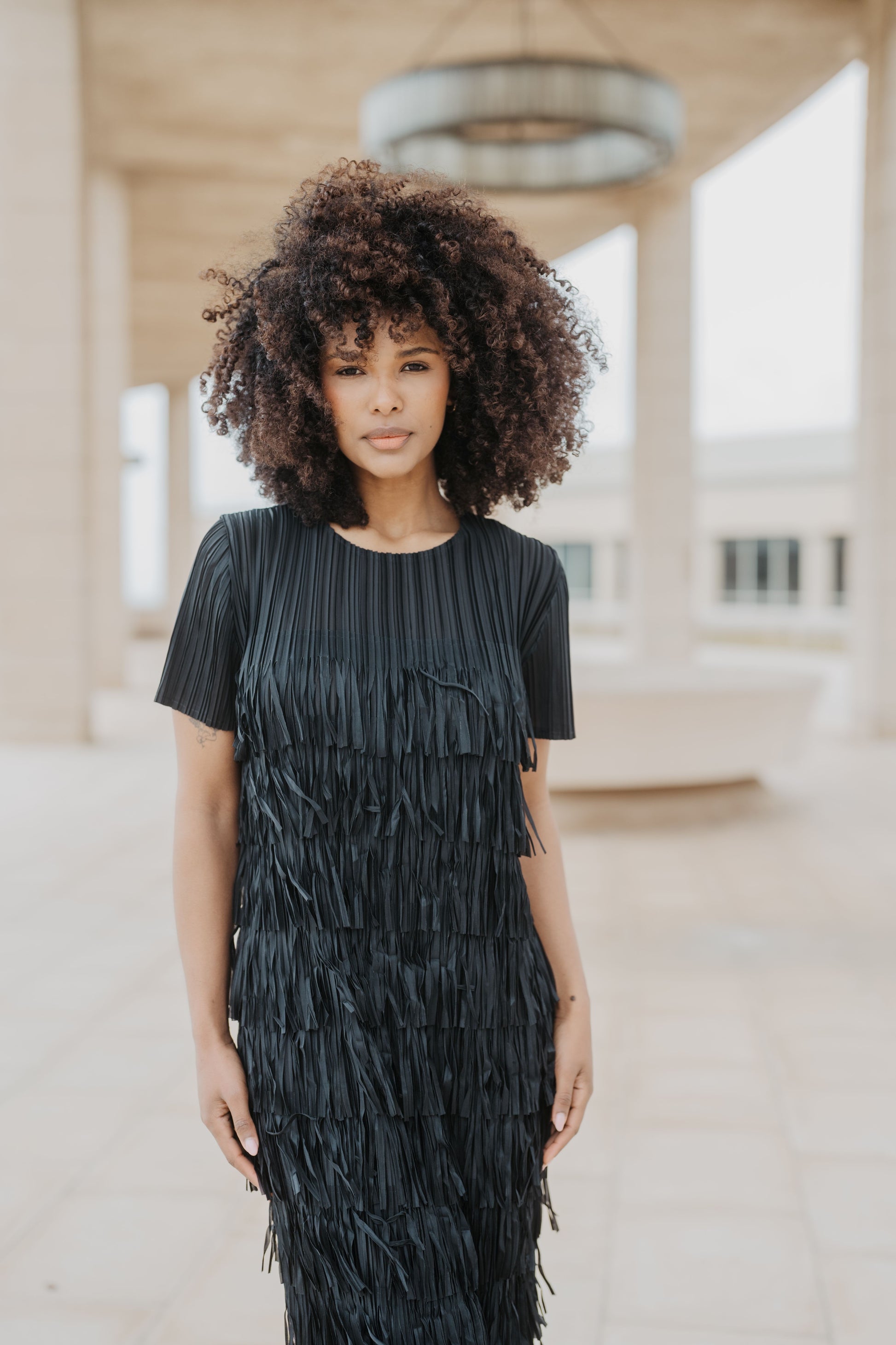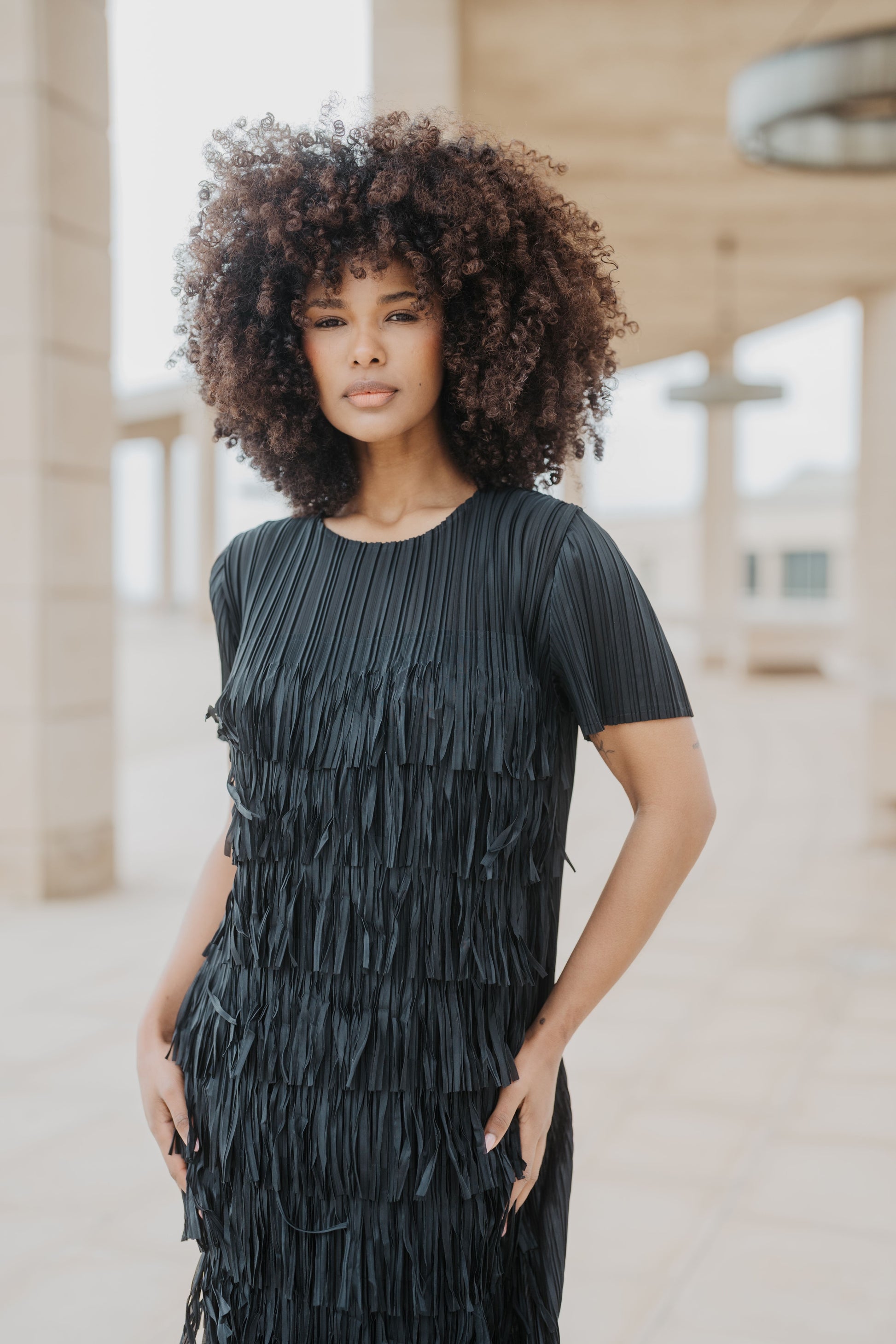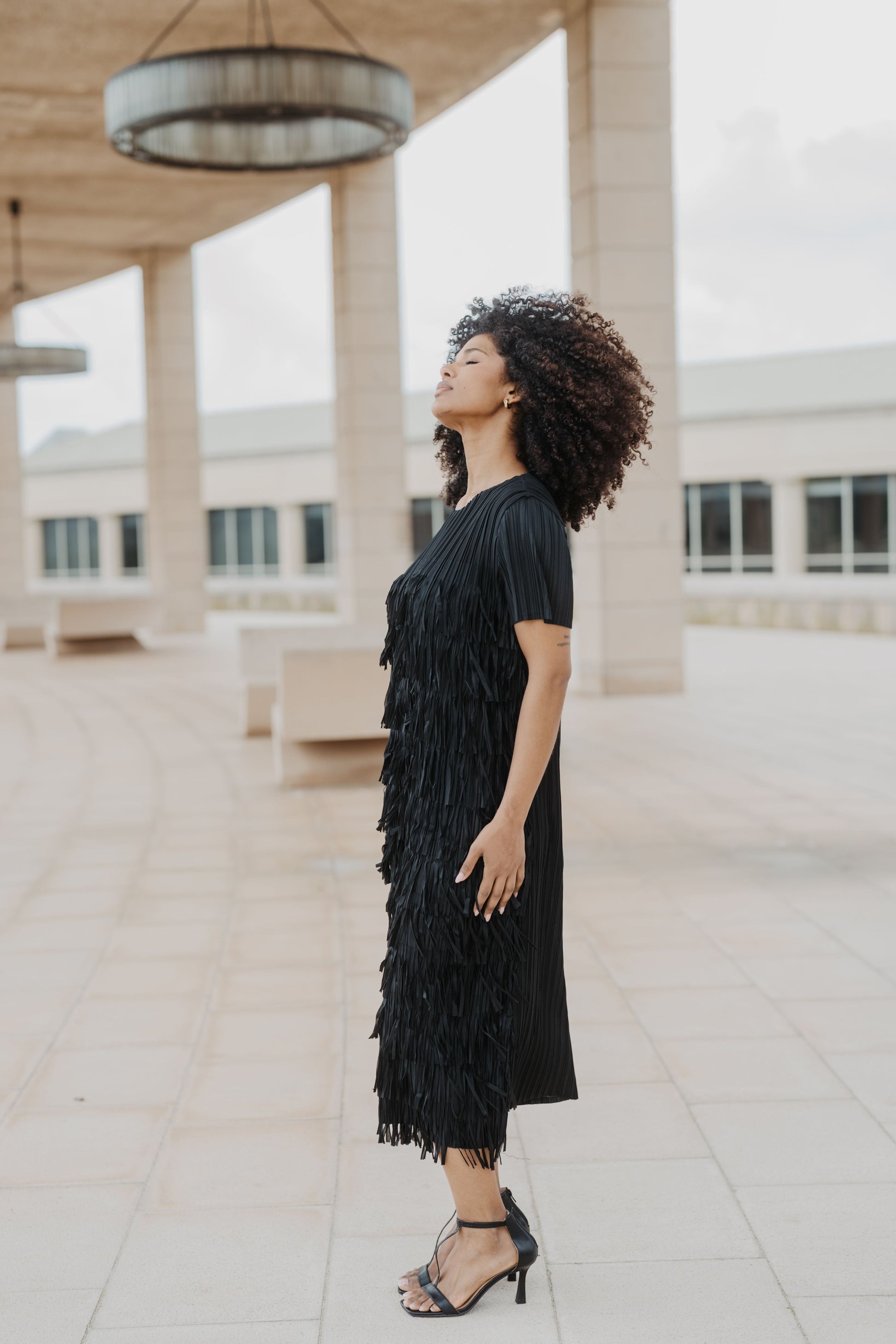 El movimiento hecho vestido. Dale vida a tu armario con esta pieza icónica diseñada para destacar. Cubierto íntegramente por flecos texturizados, este vestido midi negro ofrece un movimiento espectacular y una elegancia sin esfuerzo para cualquier evento.