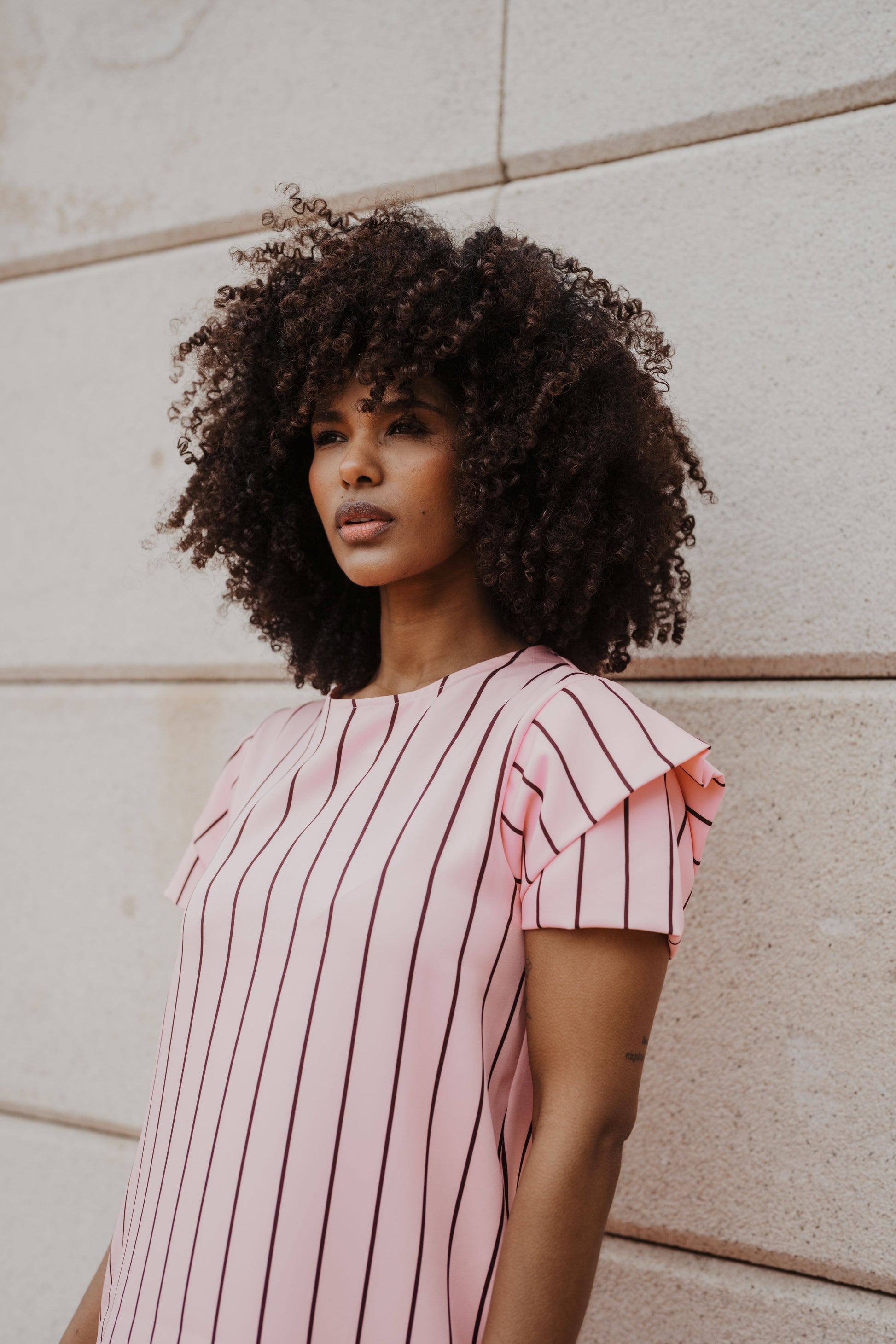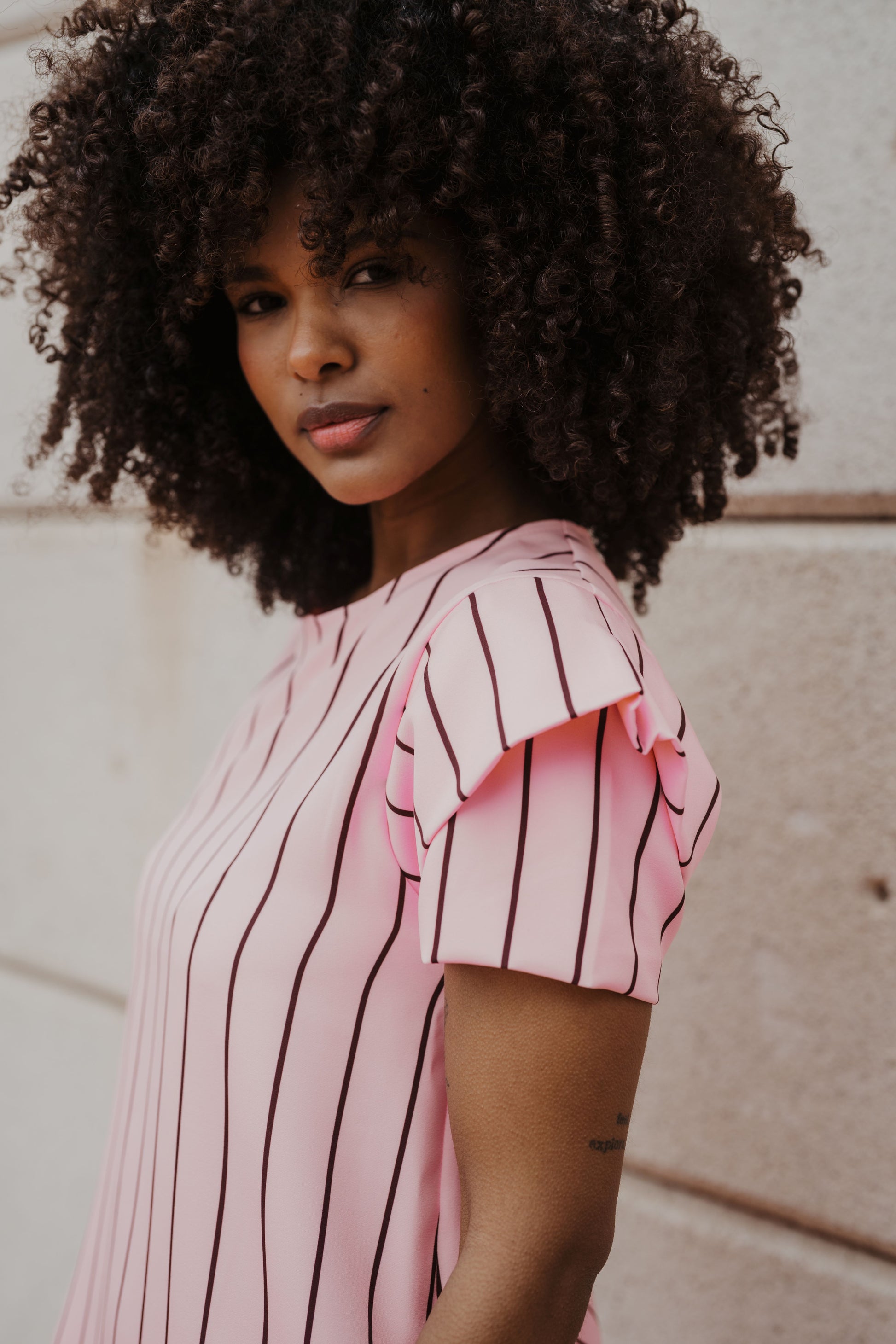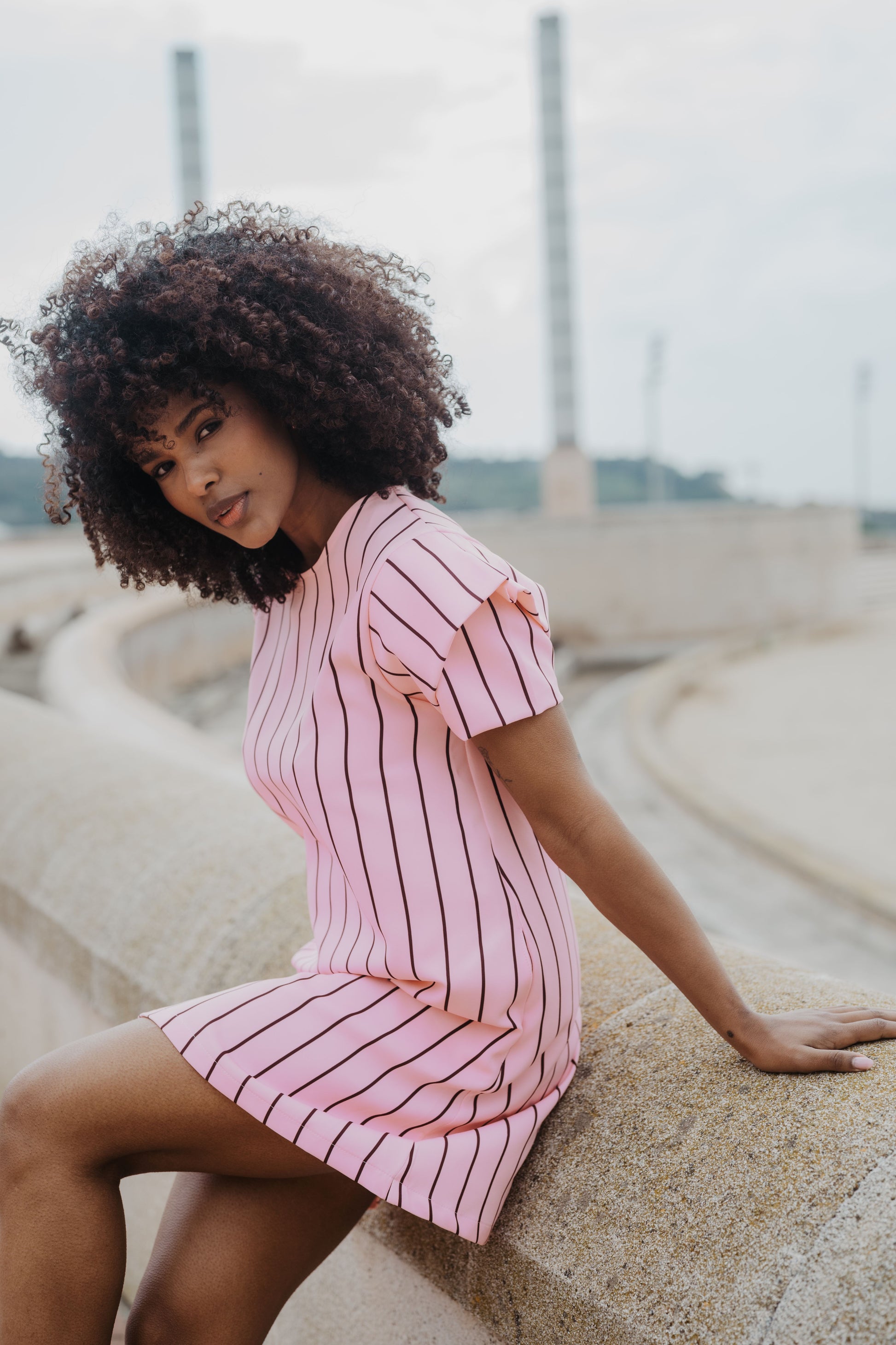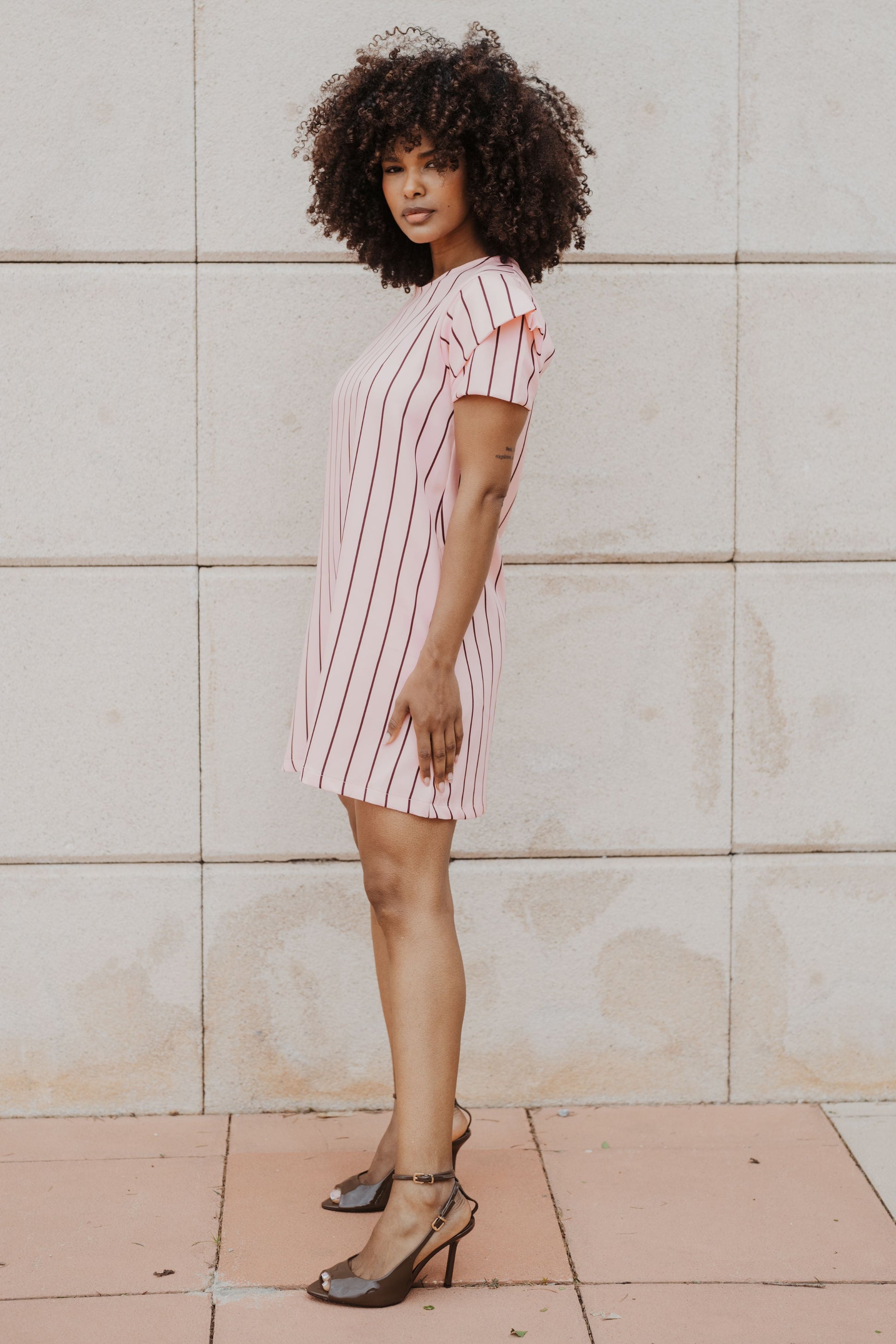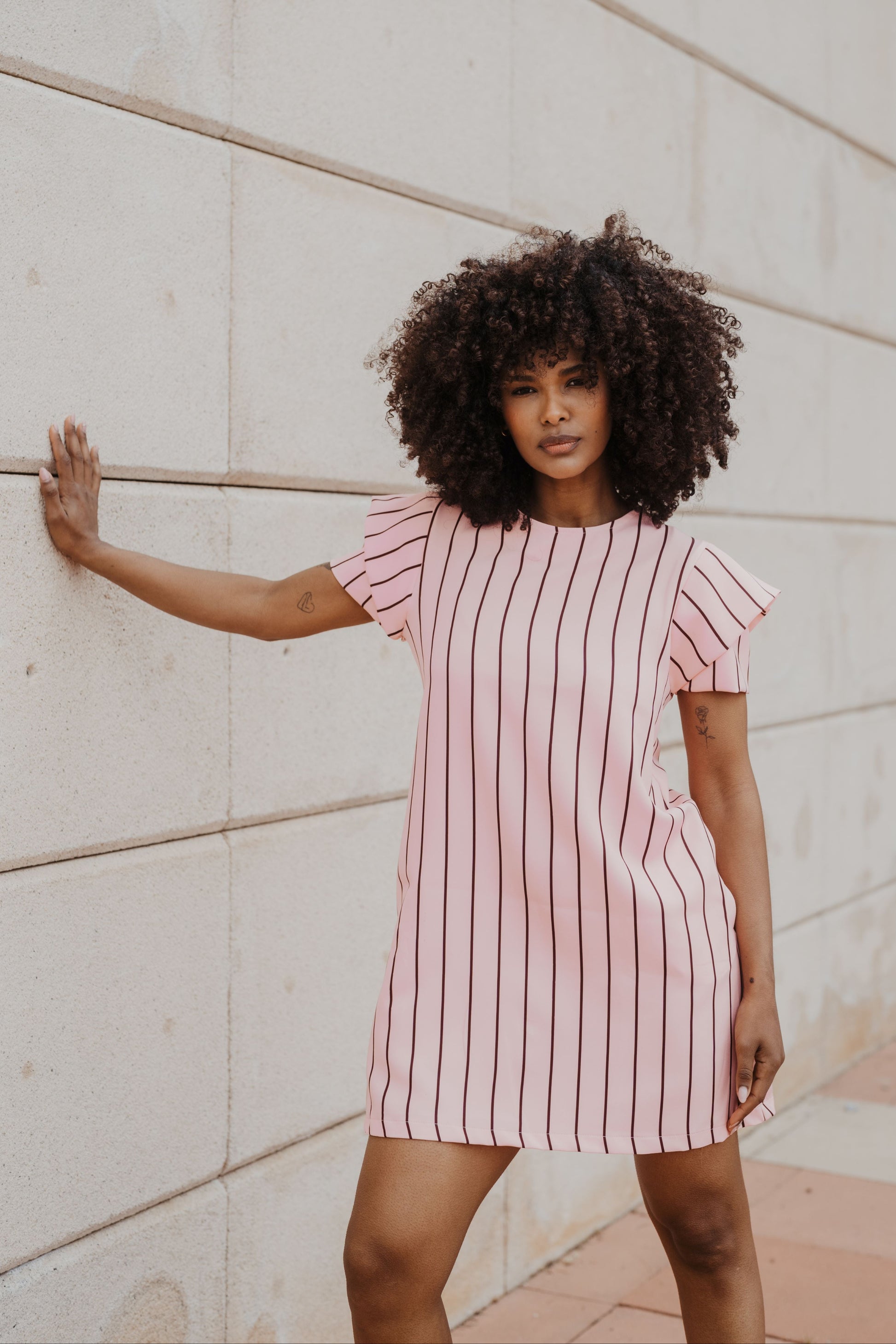 Vestido corto en tono rosa empolvado con elegantes rayas verticales en marrón chocolate que estilizan la silueta. Diseñado con un corte ligeramente evasé y mangas dobles con volante, cremallera trasera y bolsillos laterales, aporta movimiento y un toque femenino sofisticado.